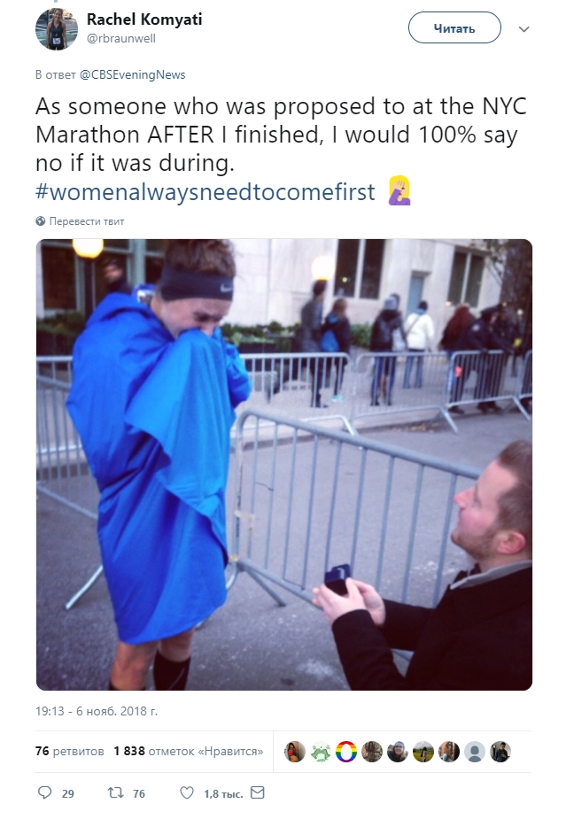 Потом в комментарии пришла участница предыдущего забега и поддержала хейтеров: «Как человек, которому было сделано предложение на Нью-Йоркском марафоне после того, как я финишировала, заявляю, что я бы 100% сказала „нет“, если бы это произошло во время забега».