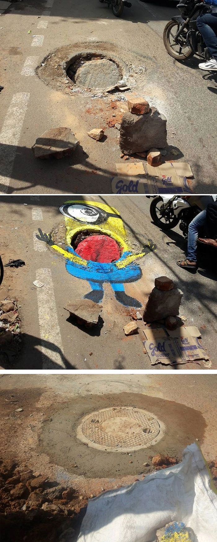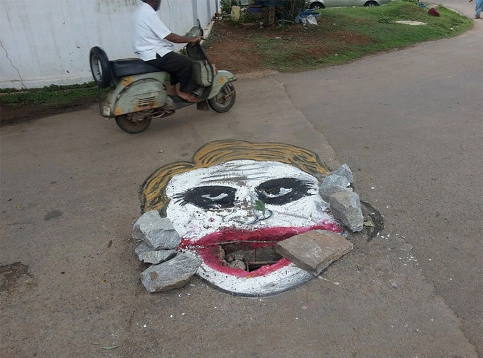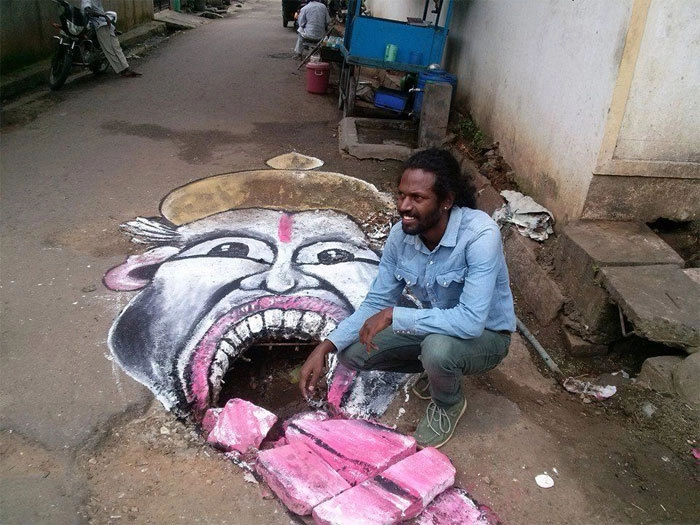 Проблема качества дорожного покрытия в Индии стоит достаточно остро. Более 3,5 тысяч людей погибли из-за аварий, произошедших на плохих дорогах, в 2018 году. Поэтому свое творчество художник Баадаль Нанджундасвами посвящает попыткам привлечь внимание к этому вопросу.