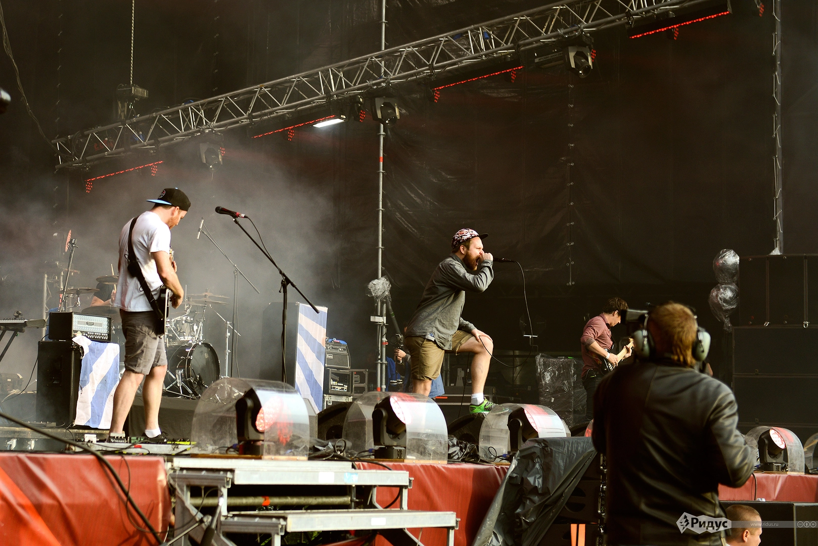 19:50 Без всяких опозданий на сцену вышли Enter Shikari. Народ уже плотно стоял, двигаясь в такт ритмичном транс-кору в очень позитивных нотах.