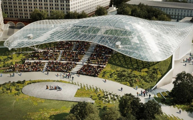 Жемчужиной парка стал примыкающий к филармонии амфитеатр: строение накроют куполом — так называемой «стеклянной корой», для защиты посетителей парка от дождя. Эта крупнейшая в мире светопрозрачная конструкция позволит поддерживать под ней теплый климат даже зимой. Амфитеатр рассчитан на 2500 человек — для посетителей будут проходить кинопоказы, концерты, лекции и другие мероприятия.