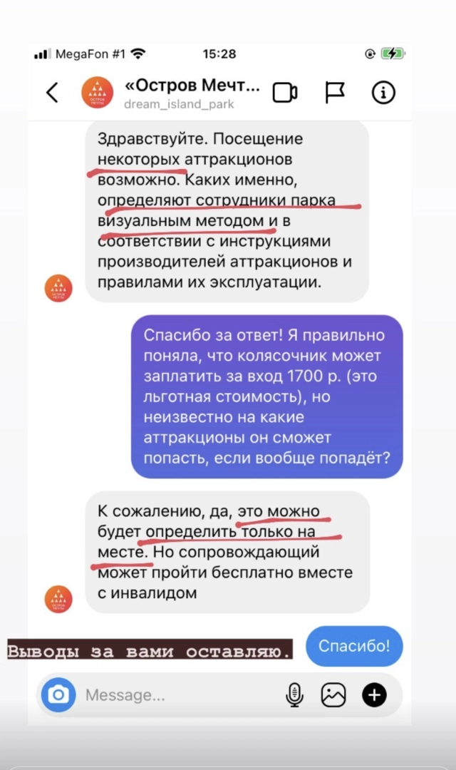 Пресс-служба парка проигнорировала значительную часть вопросов ridus.ru. Почему правила безопасности не позволяют подъехать к аттракциону на инвалидной коляске, но разрешают дойти пешком, сколько аттракционов доступны для инвалидов, каковы инструкции «Острова Мечты» по работе с инвалидами, смогут ли Ольга Кузнецова и ее муж получить обратно свои деньги, извинится ли администрация перед ними за неудобства — все это так и осталось неизвестным.