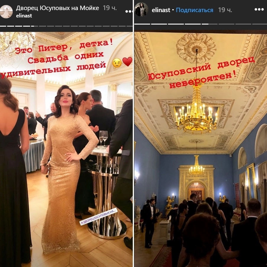 Сценарист Елена Курбатова выложила фотографии из дворца и намекнула, что была на свадьбе «одной прекрасной пары» и «удивительных людей». Она уточнила, что не может сказать, о ком шла речь.