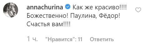 Сама новоиспеченная супруга выложила в Instagram фото в белоснежном платье с фатой и длинным шлейфом. Никаких официальных комментарием по поводу своих отношений с Федором Бондарчуком, который старшее ее на 22 года, звезда сериала «Метод» не дает. Но журналистам удалось узнать, что свадьба состоялась накануне в Юсуповском дворце в Санкт-Петербурге. Место держалось в секрете до самого последнего момента, а попасть туда без приглашения было невозможно.
