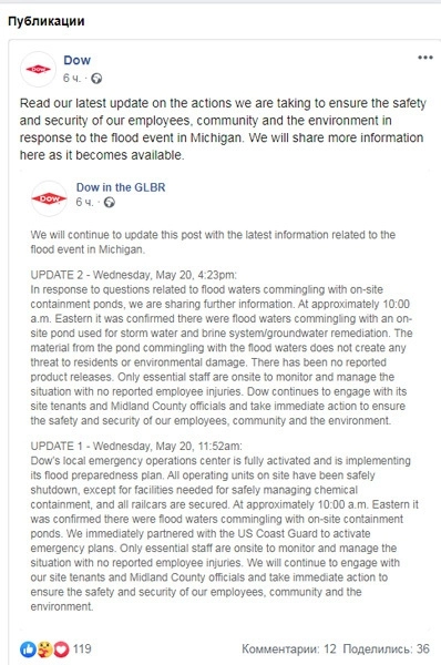 «Компания задействовала свой штаб чрезвычайных операций и готовится к наводнению. Все производство на заводе остановлено, за исключением контроля состояния химических веществ. Емкости с химикатами зафиксированы и защищены», — заверили представители компании в Facebook.
