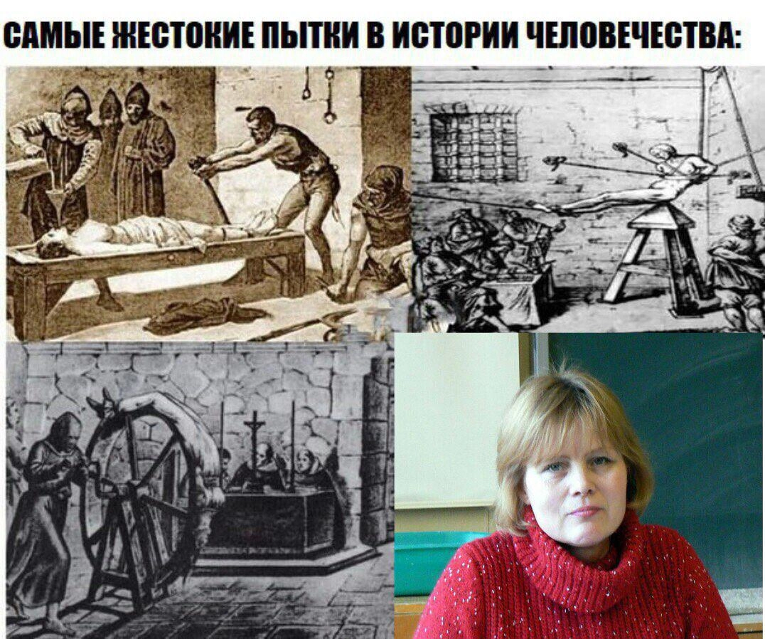 На одной из картинок под подписью «Самые жестокие пытки в истории человечества» — три средневековые гравюры, изображающие издевательства над людьми, и фотография учительницы.