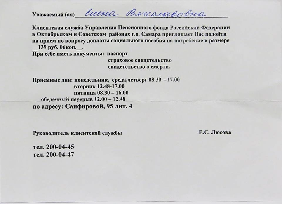 На имя скончавшейся в мае этого года жительницы Самары пришло письмо от Пенсионного фонда. Представители ведомства приглашали Елену Васину прийти для получения социального пособия на погребение в размере 139 рублей.