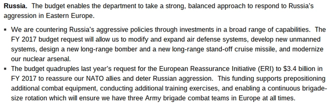 Мы противостоим агрессивной политике России посредством инвестиций в широком диапазоне возможностей. Проект бюджета на 2017 год позволит нам модифицировать и расширить системы ПВО, создать новые беспилотные системы, разработать новые бомбардировщики дальнего действия и новые крылатые ракеты большей дальности, а также модернизировать наш ядерный арсенал.