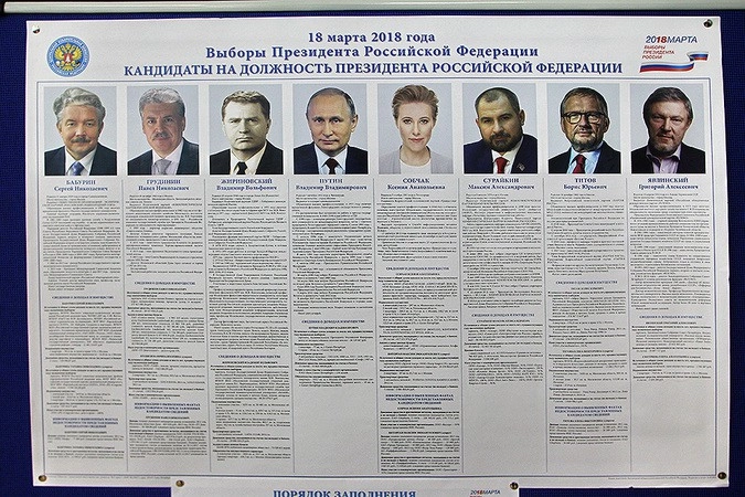 Напомним, выборы президента России пройдут 18 марта текущего года. За главный политический пост страны поборются восемь человек: Сергей Бабурин (партия «Российский общенародный союз»), Павел Грудинин (КПРФ), Владимир Жириновский (ЛДПР), Владимир Путин (самовыдвижение), Ксения Собчак («Гражданская инициатива»), Максим Сурайкин («Коммунисты России»), Борис Титов (Партия роста), Григорий Явлинский («Яблоко»).