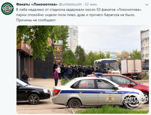 «В пабе недалеко от стадиона задержали около 50 фанатов «Локомотива», парни спокойно сидели, пили пиво», — говорится в сообщении.