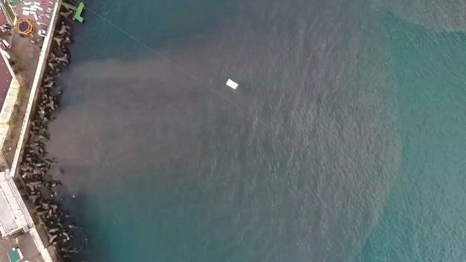 Кроме того, появились фотографии акватории Морпорта, сделанные с коптера. На них отчётливо видно пятно субстанции, которая расползается по воде.