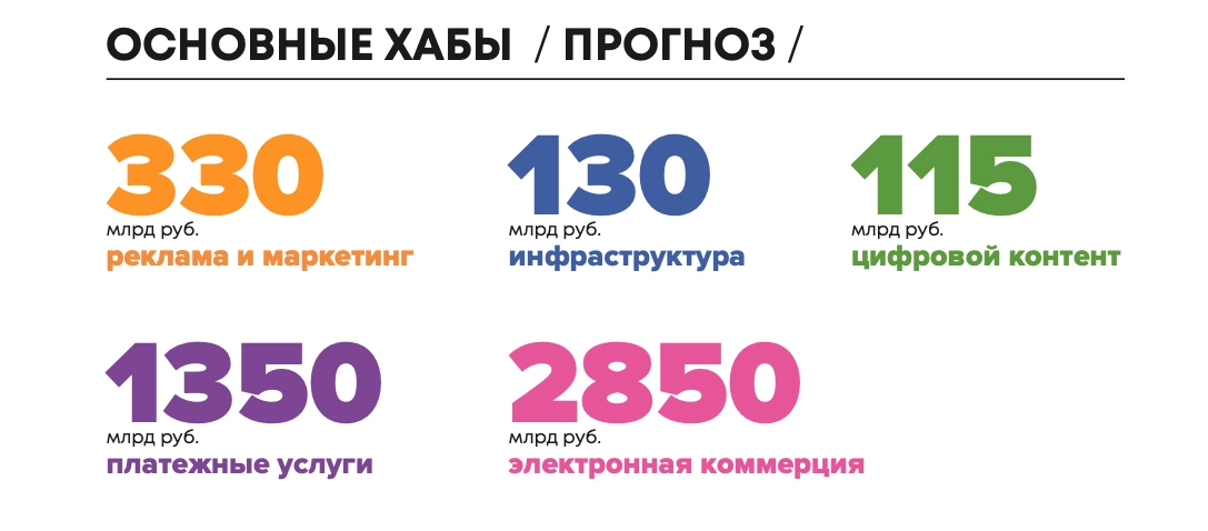 Объем хабов экономики 26-летнего Рунета выглядит так: реклама и маркетинг — 330 млрд рублей, инфраструктура — 130 млрд, электронная коммерция — 2850 млрд, платежные услуги — 1350 млрд, цифровой контент — 115 млрд. Фактически более 50% отечественной экономики сегодня зависит от Рунета.