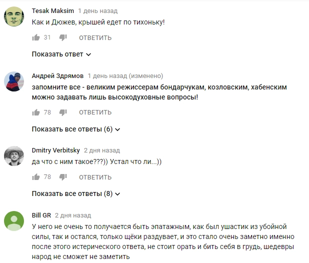 Затем артист с явным раздражением стал развивать свою мысль, призвав в итоге «расчесывать наш кинематограф на предельно понятные вещи, чтобы создать „взлетную полосу“ для следующего поколения, которое будет заботиться о нас».