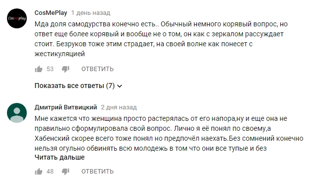 Хабенский очень болезненно воспринял этот вопрос, вскочил с места с микрофоном и начал интересоваться у женщины, что именно ее волнует. Не удовлетворившись ее ответом, он довольно эмоционально задал ей такой вопрос: «Вы что, считаете, что тупые люди рядом с вами?»