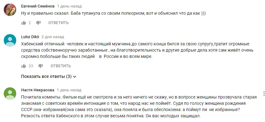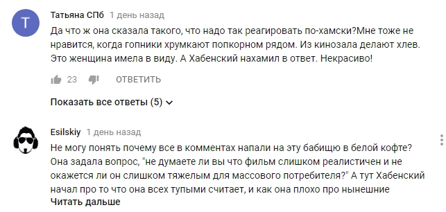 Видео, запечатлевшее разговор автора фильма со зрительницей, вызвало бурную полемику в Сети. Одни приняли сторону Хабенского, другие его резко раскритиковали, а третьи заявили, что виноваты обе стороны. Кому-то показалось, что вопрос зрительницы был не совсем понятен, а некоторые посчитали реакцию Хабенского чересчур эмоциональной.