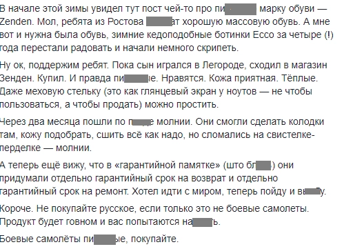Пользователей Сети поразил тот факт, что в полемику с клиентом вступил директор фирмы, назвавший покупателя мерзавцем. При этом он сам отметил, что обувь российской фирмы шьется в Китае.