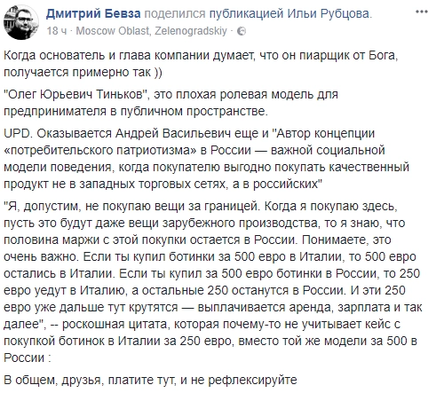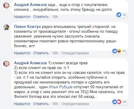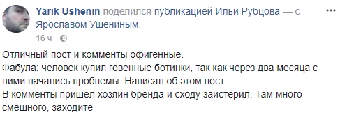 «У меня были десятки аналогичных споров с интернет-блогерами. Только на прямой вопрос, где купили или возвращали ботинки в наш магазин, никто не смог ответить. У нас по итогам 2017 года 0,6% показатель возврата ношеного брака. Наверное, лучший в отрасли. Хотя это больше 70 тысяч пар. Уж извините, много продаем. И вообще прошу иметь уважение к России и нашим брендам», — написал Павлов.