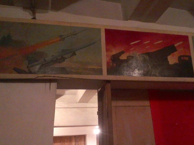 Обходя кровати, застеленные кое-как, тумбочки с банками солений, сумки, электрочайники, проходим в другой угол убежища. Здесь ворота с толстыми, закручиваемыми створами. В 1937-ом к авиаударам здесь подготовились основательно. Наверху сушится бельё, сделана походная плитка: несколько кирпичей, да решётка с кастрюлями, под ними огонь.