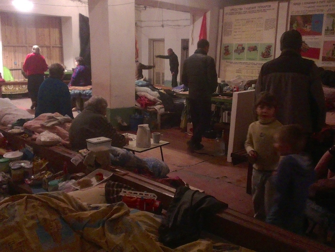 Будка рядом и ведёт в это самое убежище, старейшее в Донецке, 37-го года постройки. На ступеньках встречаю ещё пару мальчишек, метров 20 вниз и вот, довольно тёплый бетонный зал. На топчанах, раскладушках преимущественно женщины средних лет и совсем пожилые дамы. На стенах изобилие плакатов брежневских времён о гражданской обороне. Картинки с «Градами», гаубицами. Инфографика со способами укрытия от пожаров и взрывных волн частично завешаны пуховиками, халатами. Любопытно, какими бы глазами посмотрели строившие и оформлявшие это укрытие на события сегодняшних дней, на то, кто и от чьих снарядов здесь прячется.