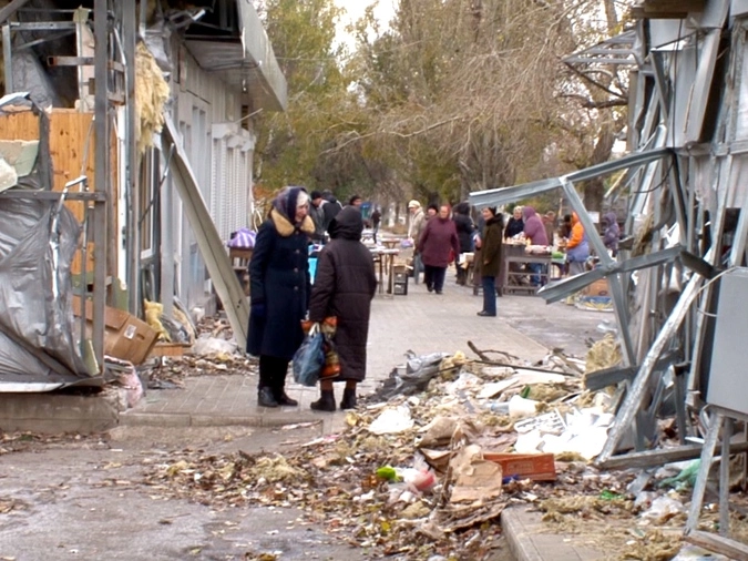 А вот и Куйбышевский «рынок». На повороте стоит около десятка торговок, рядом развороченная ещё августовским миномётным снарядом остановка. Овощи, свечи, мясо, рыба. Покупателей несколько человек, все заявляют, что стреляют вокруг «постоянно, каждый день».