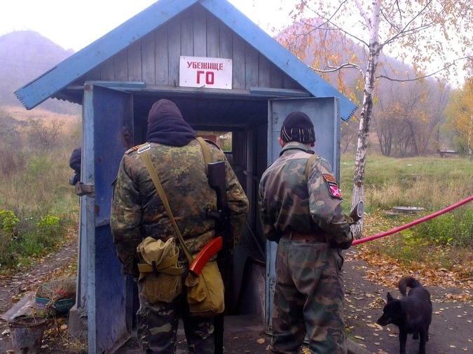 Вот деревянная будка с распахнутой дверью, посреди пустыря. На горизонте — терриконы, холмы из отработанной шахтной породы, поблизости двухэтажные хрущёвки и частный сектор. Проём в будке уводит в глубину, откуда выходят несколько мальчишек лет 8 — 12-ти. Здесь же несколько вооружённых бойцов ДНР. Нет сомнений, что местные. Одеты кое-как, обувь — кроссовки, разношенные старые ботинки, на паре парней потёртые, грязные камуфляжные бушлаты, ещё на двух вовсе ветровки. Никаких знаков отличия. Говорят, что из этого же района, с шахт «Трудовские». Показывают в сторону, через дома: