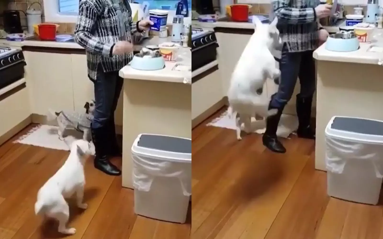 Если вам хочется быстро избавиться от лишних калорий перед сытным обедом, берите пример с собакена из этого ролика. Пока хозяйка накладывала корм в его миску, он устроил себе мини-тренировку с активными прыжками на месте.