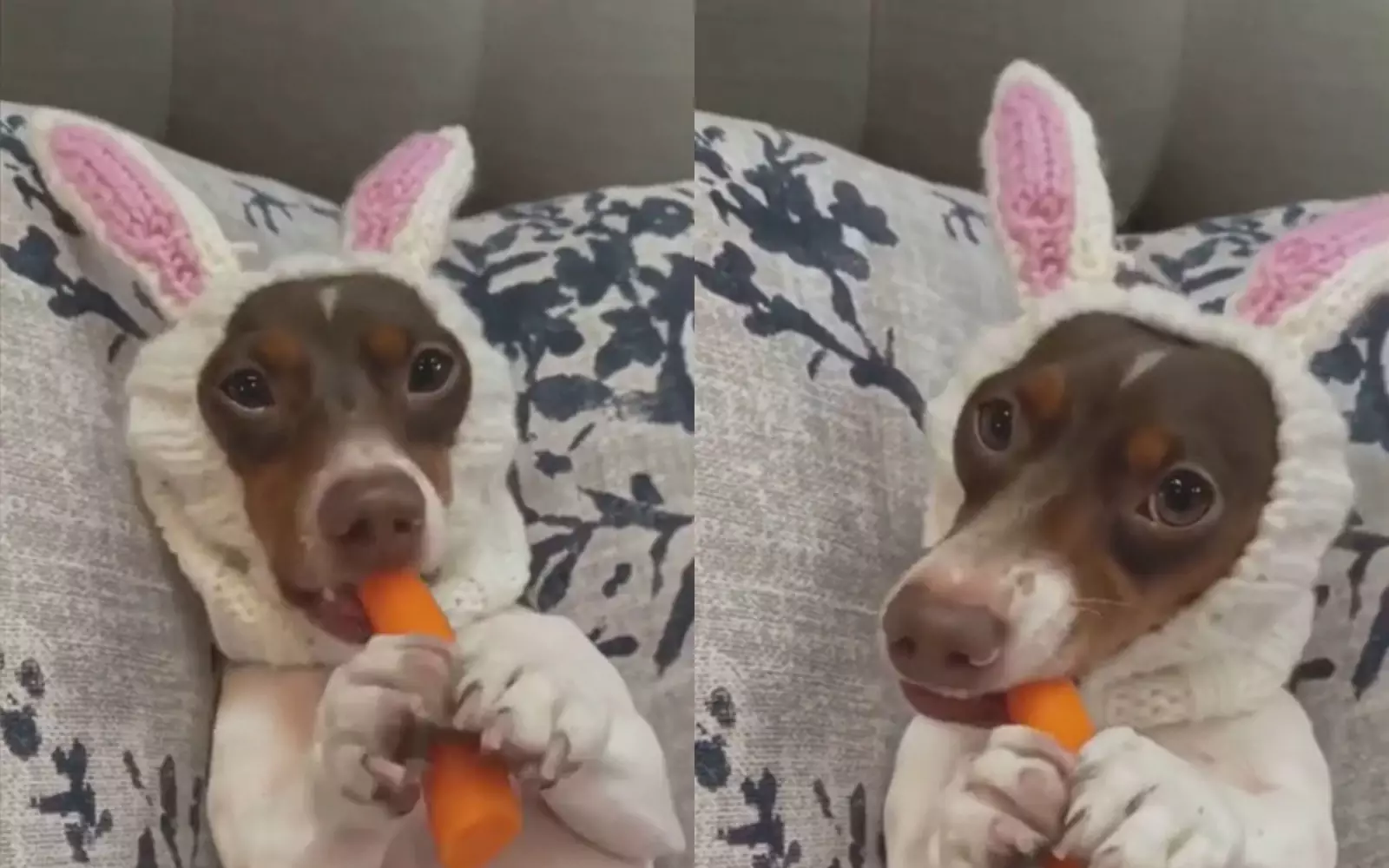 Овощи очень полезны не только для людей, но и для животных. Но часто хвостатых, как и маленьких детей, трудно заставить съесть брокколи, капусту или морковку. Однако пёсель из этого видео с удовольствием грызет морковь, будто в прошлой жизни был кроликом. Владельцы собакена тоже считают его кроликом, поэтому связали для него забавную шапочку с ушками, которая сделала его просто невероятно милым.