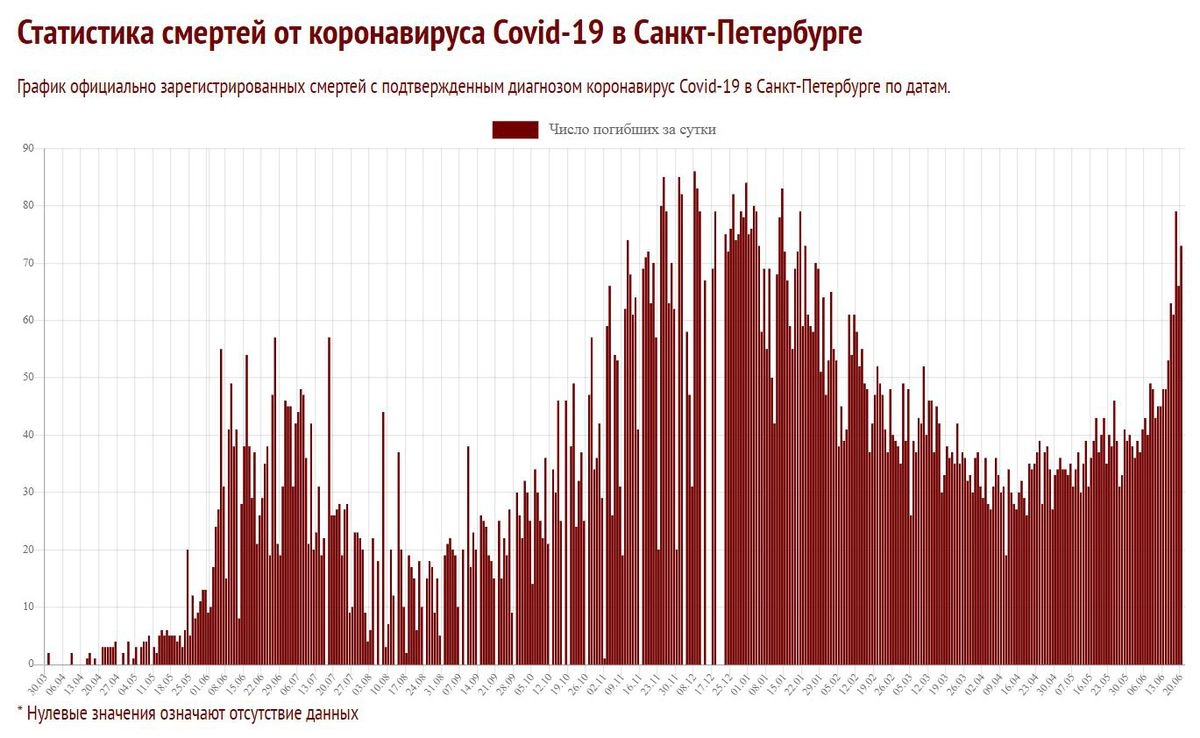 График случаев смерти от COVID-19 в Санкт-Петербурге к 21 июня 2021 года. Данные с сайта Coronavirus-monitor.info.