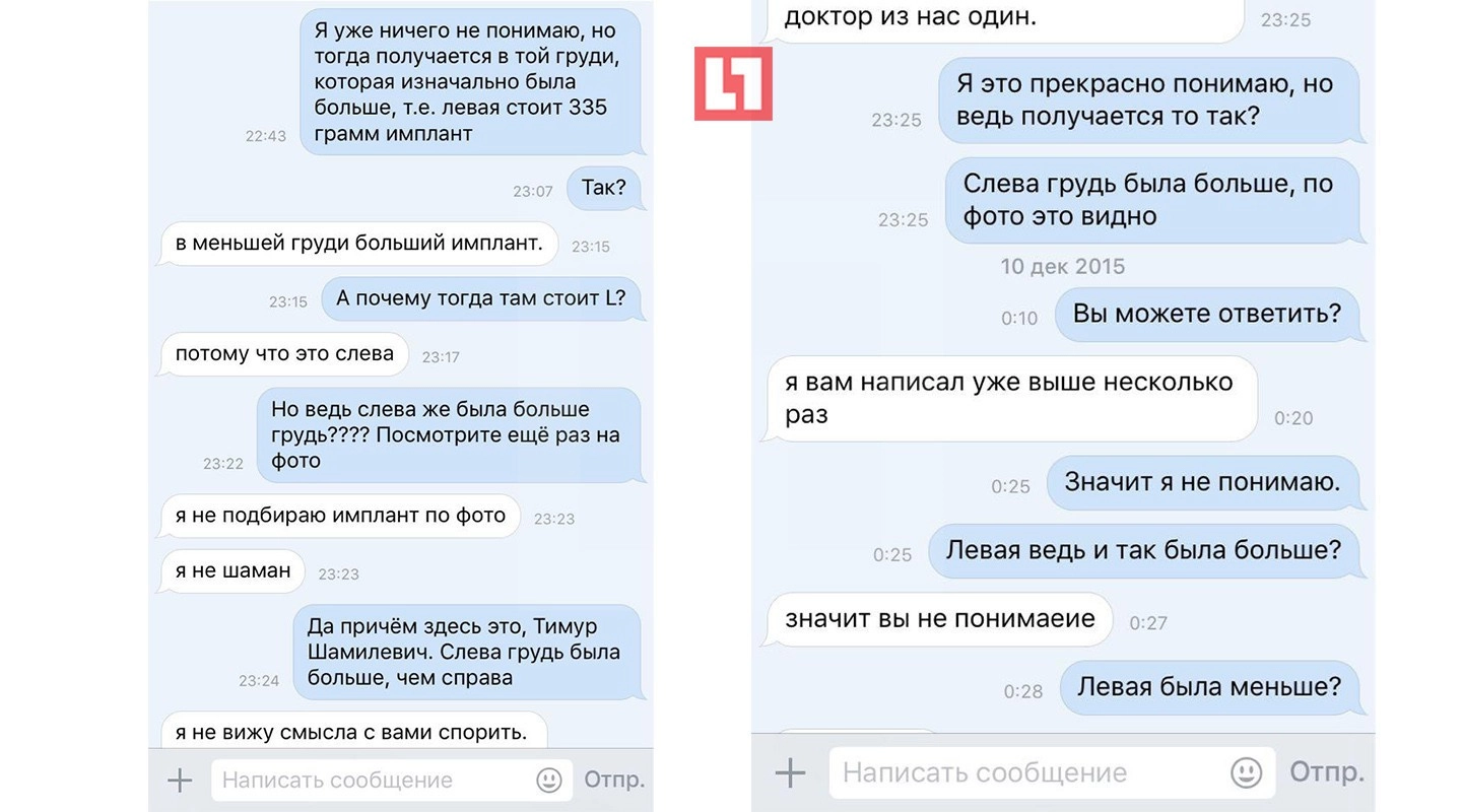 Сообщается, что в документации к имплантам было написано, что они разного размера, но изначально хирург на это внимание не обратил, а затем утверждал, что пациентка просто «ничего не понимает».