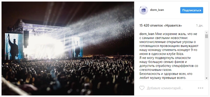 Накануне певец был вынужден отменить свой концерт в Одессе в связи с угрозами радикалов. «Я не могу подвергнуть опасности нашу большую семью фанов и допустить отработку спецэффектов со слезоточивым газом», — написал Дорн в Instagram, объявляя о том, что концерт, запланированный на 9 июня, не состоится. Угрозы в адрес певца от националистов прозвучали после того, как они сорвали концерт певицы Светланы Лободы в том же одесском ночном клубе, где планировалось выступление Дорна.