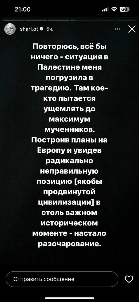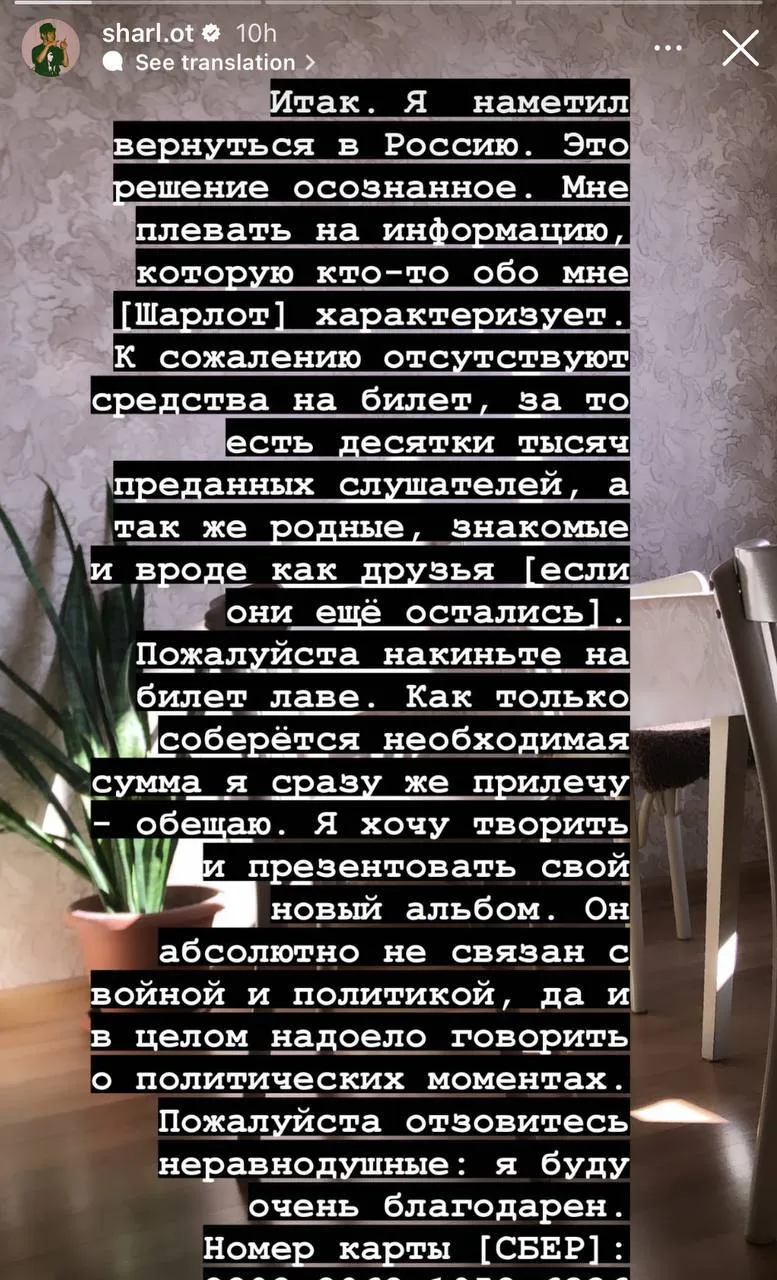 Двенадцатого ноября Шарлот опубликовал в Instagram* несколько косноязычное заявление о том, что планирует вернуться из «релокации» в Россию и что это его «осознанное решение».