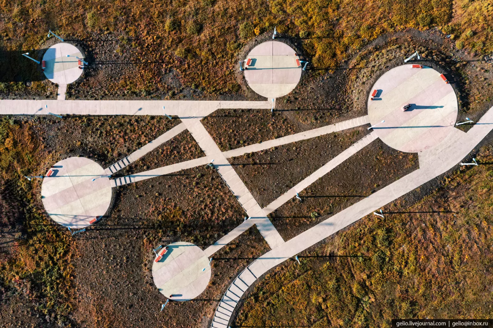 26. Небольшой парк с лавочками. В обычном городе территорию засадили бы деревьями и кустарником, но в Певеке такая растительность не приживается из-за морозов и ветров. Во всем городе нет ни одного дерева, лето короткое и суровое.