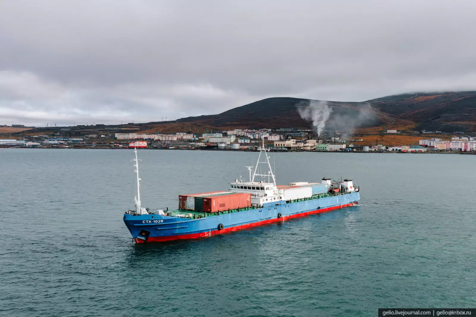 27. Вокруг Певека на многие сотни километров расстилается тундра. По суше можно добраться только до города Билибино и нескольких шахтерских поселков, откуда в порт доставляют руду для отправки морским путем.