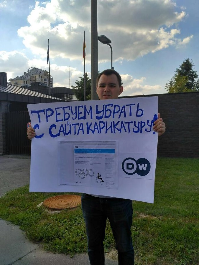 Участники пикета вышли к стенам посольства с лозунгами: «Требуем извинений от Deutsche Welle перед российскими паралимпийцами», «Требуем убрать с сайта карикатуру», «Прекратите издеваться над олимпийской символикой».