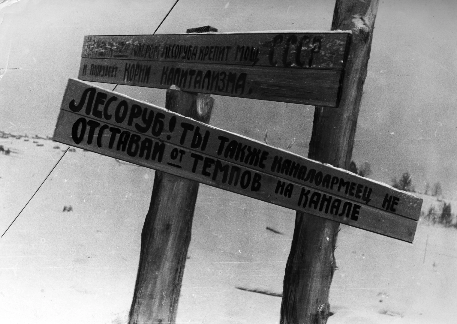 Где-то посередине между официальными документами и письмами – плакаты и лозунги, написанные лагерными художниками афиши, стенгазеты и прочие элементы «художественного оформления» действительности за колючей проволокой. Эти буквы, надписи и заголовки наиболее интересны и наиболее неоднозначны с точки зрения этической природы своего возникновения – они созданы заключенными и служат целям системы. С другой стороны, они позволяют художникам-заключенным выжить, избежав общих работ.