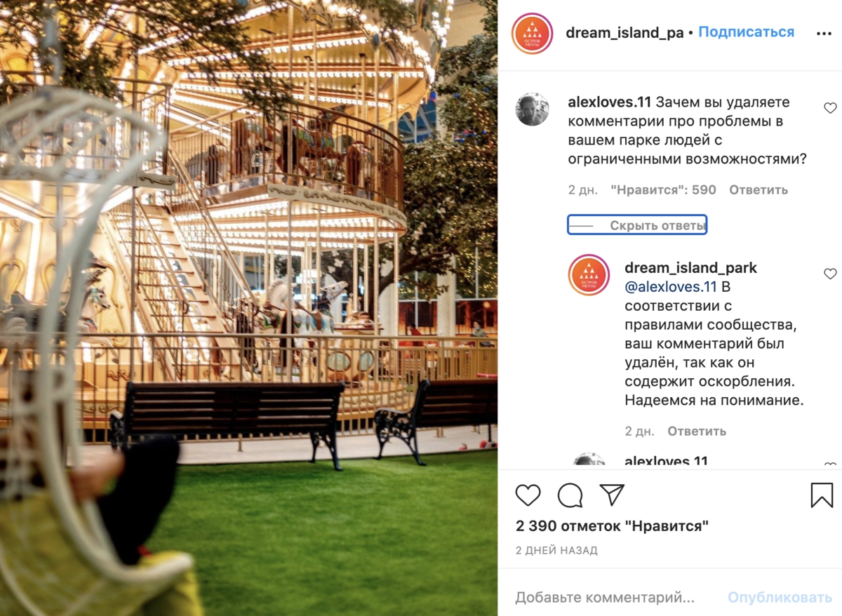 Ольга Кузнецова рассказала также, что перед посещением парка отправила запрос в Instagram «Острова Мечты» с вопросом, действительно ли инвалиды-колясочники могут посещать аттракционы и получила следующий ответ: