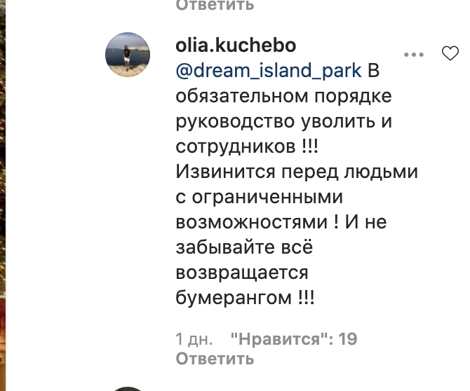 Рассказ Кузнецовой о порядках в парке вызвал волну выступлений в поддержку инвалидов. Подписчики страницы парка в Instagram потребовали от владельцев «Острова мечты» уволить руководство и сотрудников, а затем принести извинения натерпевшимся в парке колясочникам.