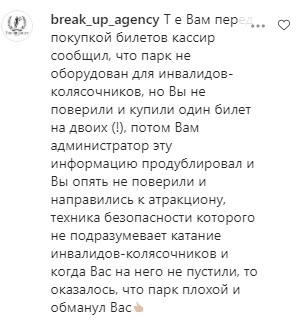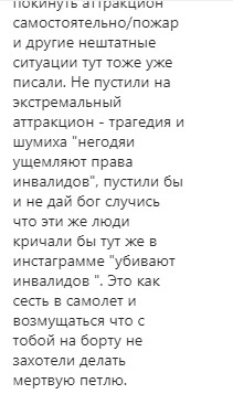 Интересно, что многие подписчики Кузнецовой в соцсети не поняли ее возмущения. По их мнению, с посетителей-инвалидов было достаточно и того, что кассирша предупредила их на входе, а отказ допускать их на аттракционы абсолютно оправдан возможной угрозой здоровью колясочников.