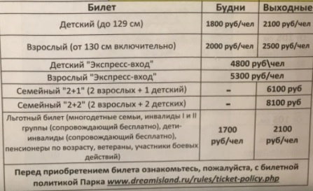 «Остров Мечты» позиционирует себя как крупнейший крытый тематический парк развлечений в Европе. Он открылся в Москве 29 февраля этого года, на месте, где еще при мэре Лужкове обещали построить «русский Диснейленд». Общая стоимость первой очереди проекта составляет 81 млрд рублей. Цены парка на билеты соответствуют: самый дешевый билет — льготный в будни — стоит 1700 рублей, а семейный билет для одного ребенка и родителей в выходные обойдется в 6100 рублей.