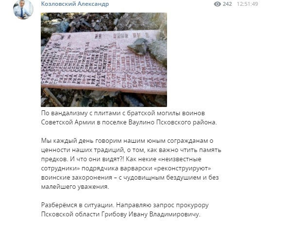 Депутат Государственной думы от Псковской области Александр Козловский направил прокурору региона Ивану Грибову запрос по поводу разрушения братской могилы советских солдат в поселке Ваулино в окрестностях Пскова.