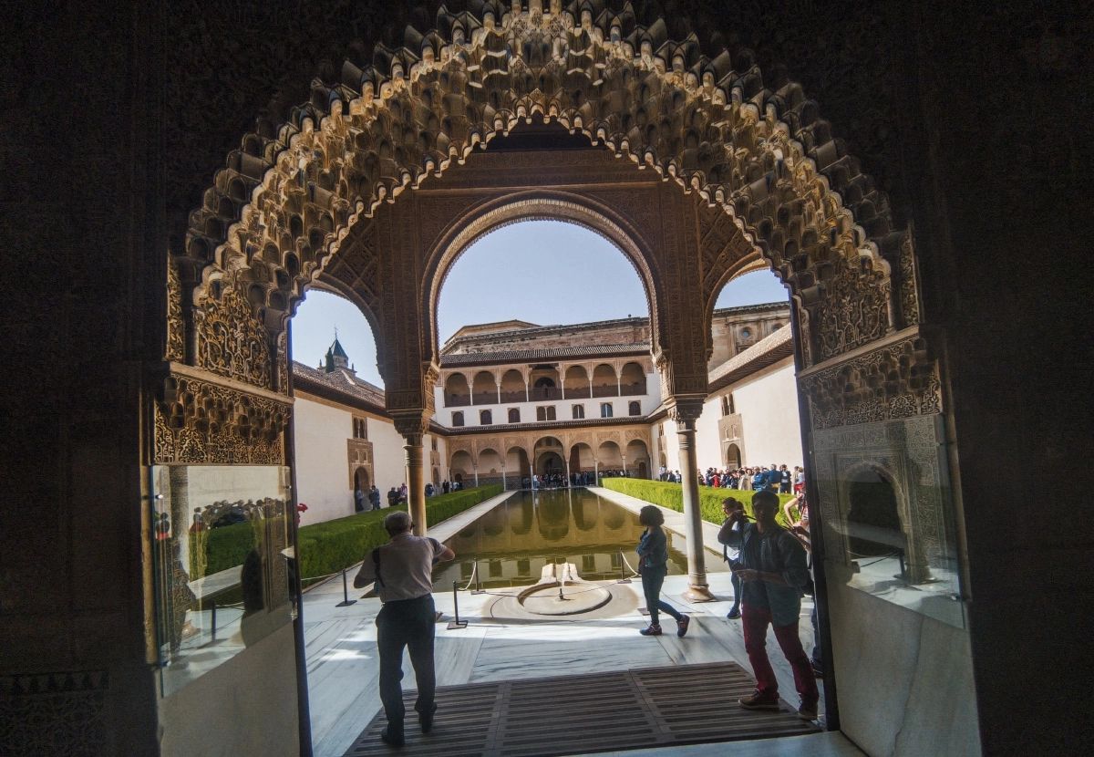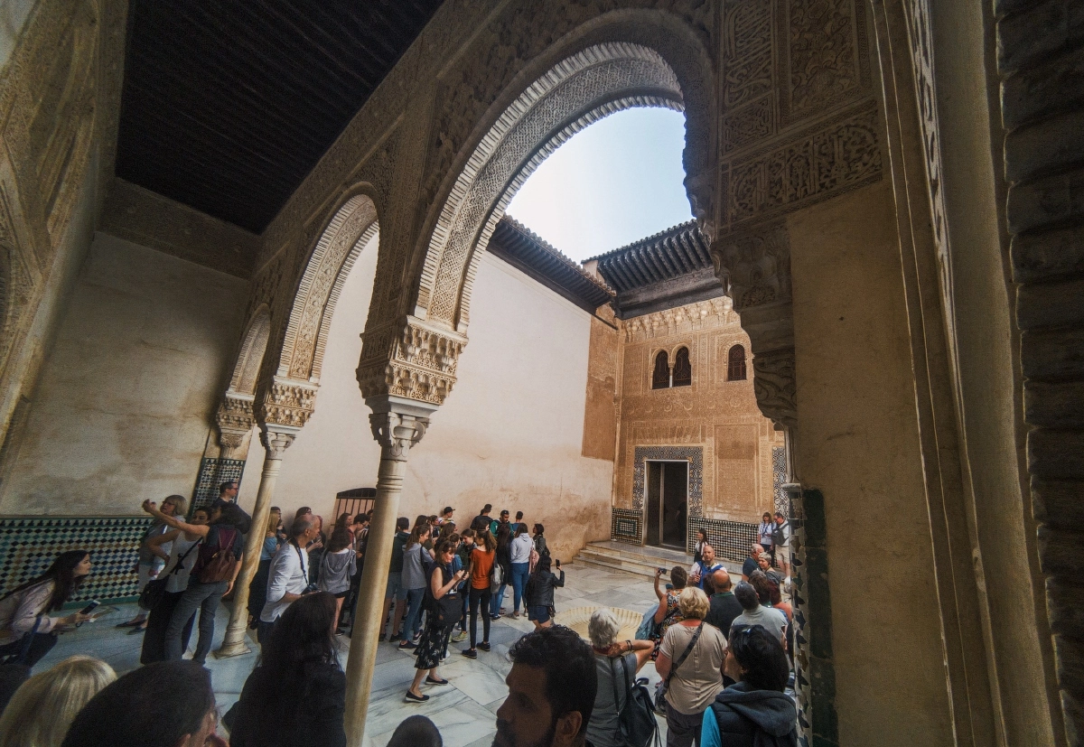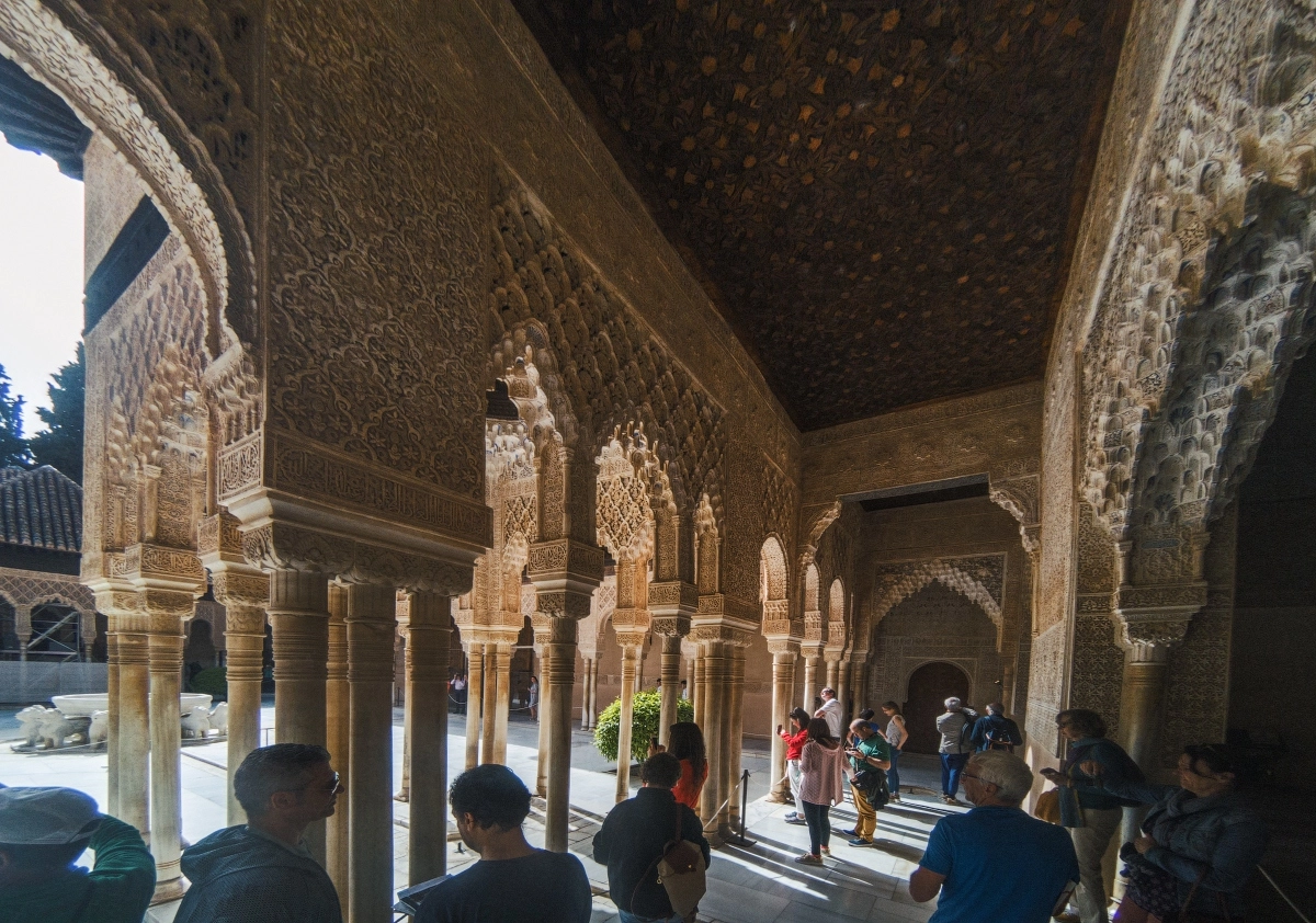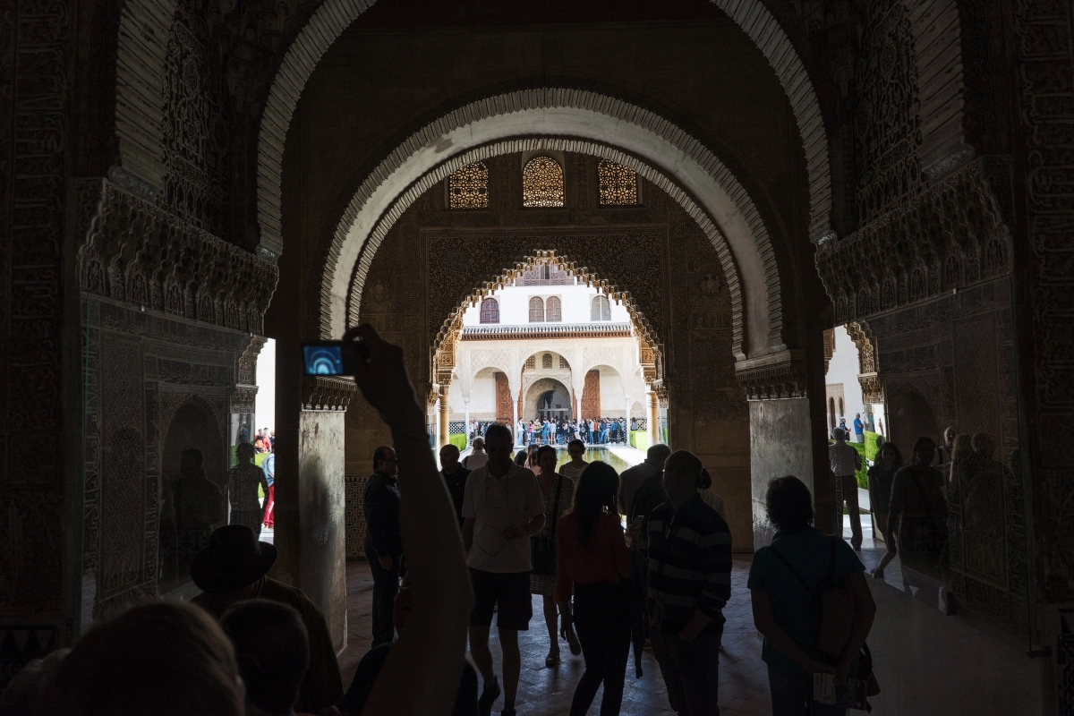 Время X, мы внутри. И вроде пускают ограниченное количество туристов, но все равно толпы. Что удивительно, учитывая как трудно достать билеты, я по наивности полагал хотя бы отсутствие давки. Нам не привыкать, активно работаем локтями и наслаждаемся красотами резиденции мусульманской династии Насридов 13го века. Поглазеть тут есть на что.