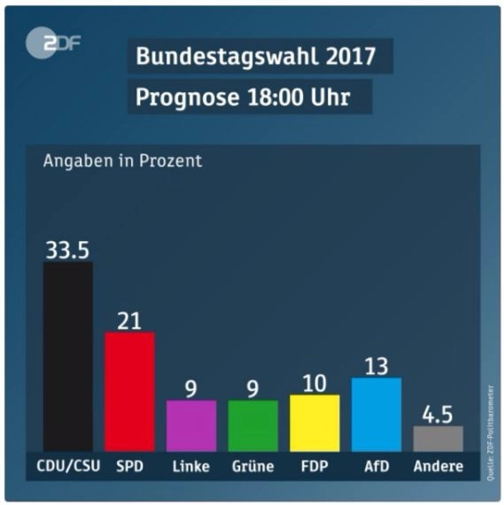 Судя по данным экзитполов, возглавляемый канцлером Германии Ангелой Меркель блок ХДС/ХСС, лидирует на выборах в немецкий парламент с 33,5% голосов.