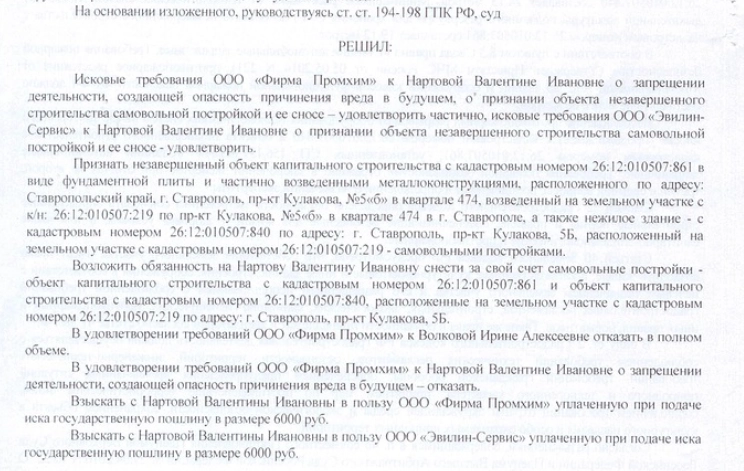 Ставропольский комитет по градостроительству также выступил в защиту хоккейной школы. Но в итоге 29 октября суд Промышленного района принял решение о сносе. Хотя, как утверждает адвокат Анатолия Нартова Галина Колпикова, основания для такого решения сомнительны.