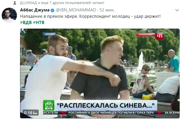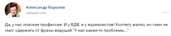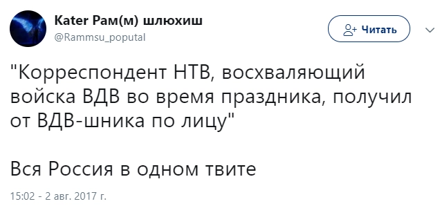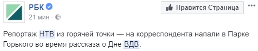 Инцидент в парке Горького с журналистом НТВ в Рунете восприняли с энтузиазмом. Многие отнеслись к ситуации с юмором и похвалили корреспондента Никиту Развозжаева за то, что держит удар. Некоторые даже посчитали это лучшим сюжетом со Дня ВДВ в Москве.