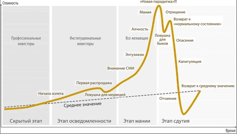 Энтузиасты доводят актив до довольно высокого уровня, затем к ним присоединяются все желающие, мотивированные исключительно алчностью, а не инвестиционными соображениями, и в кульминации мы сталкиваемся с манией.