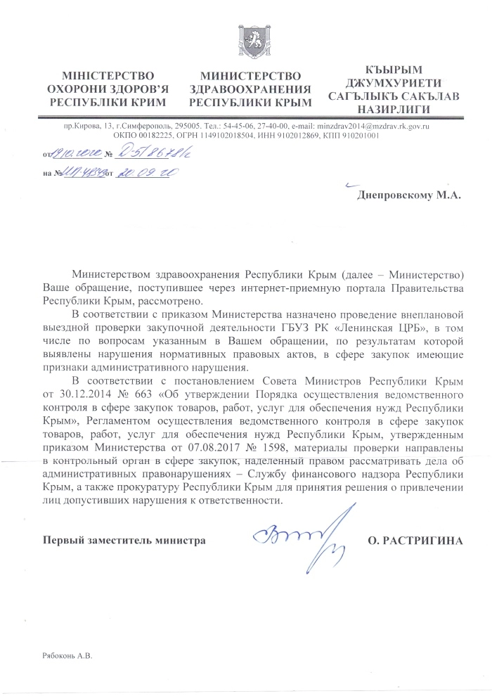 В ходе проверок выявлены нарушения законодательства, в отношении главврача возбуждены дела об административных нарушениях. Службой Крымфиннадзора проводится дополнительная проверка закупочной деятельности ЦРБ.