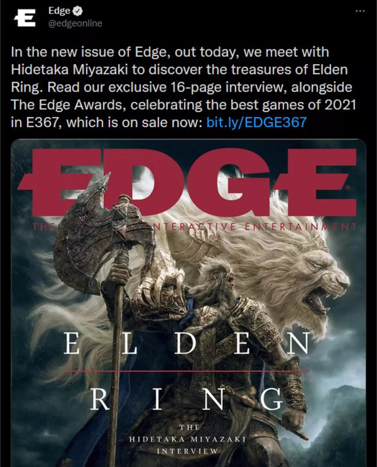 Миядзаки называет Elden Ring «кульминацией всего, что мы сделали с серией Dark Souls и нашими играми до сих пор», а также замечает, что это «совершенно новый опыт, который был невозможен раньше».