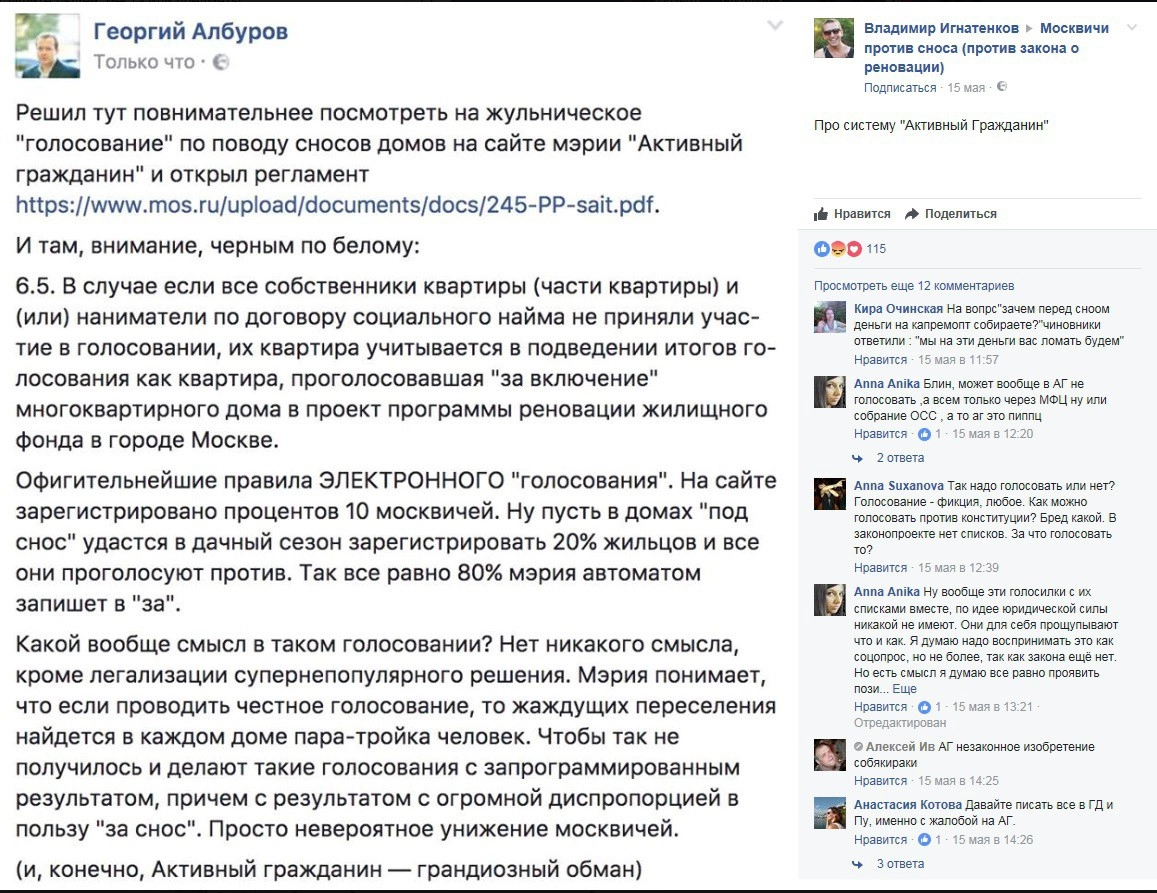 Наибольшее количество вопросов вызывает сама идея голосования, отраженная в Постановлении Правительства Москвы № 245-ПП от 02 мая 2017 года под громким названием «Об учете мнения населения по проекту реновации жилищного фонда в городе Москве». По замыслу городских властей, именно по его результатам будет приниматься решение о сносе того или иного дома, предварительно включенного в программу реновации.