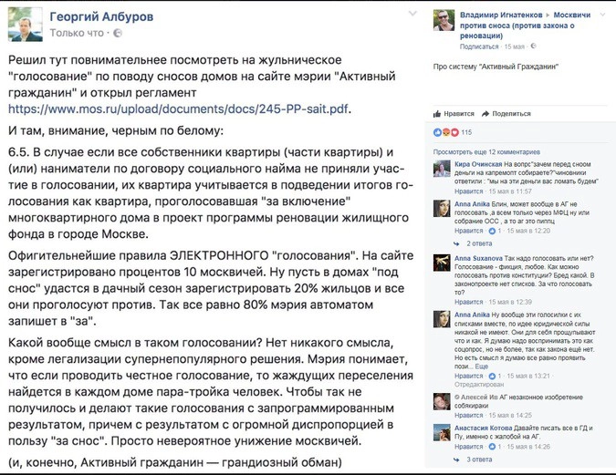 Мнение той или иной группы людей, независимо от ее размера, не имеет обязательной силы, потому что это тогда называлось бы не демократией (электронной или какой угодно), а охлократией — властью толпы, — говорит юрист. — Для принятия решений существуют прописанные в законах процедуры, и ни в одном законе РФ или города Москвы не упоминается голосование на сайте мэрии в качестве источника законодательной инициативы или тем более исполнительных действий.