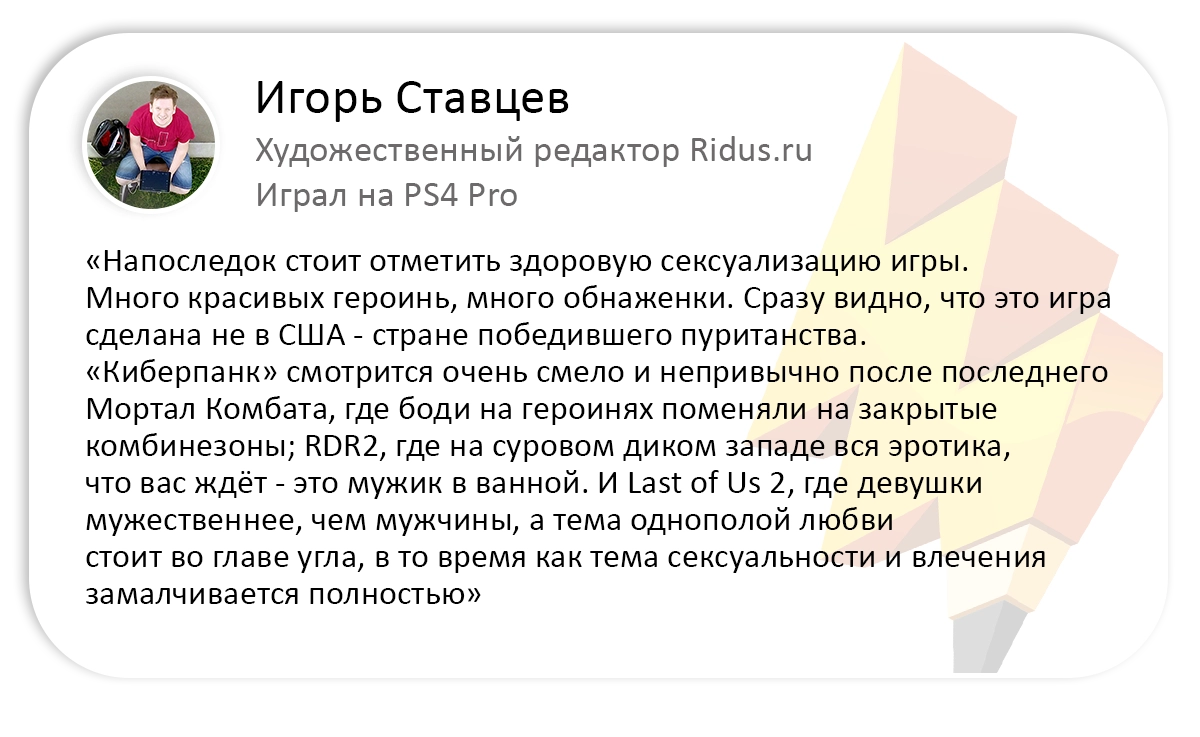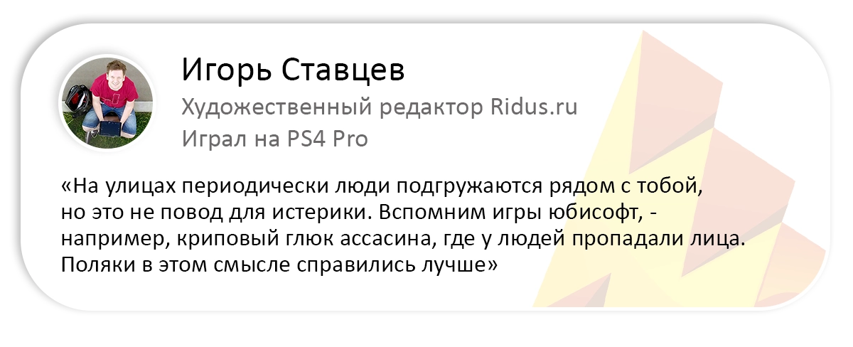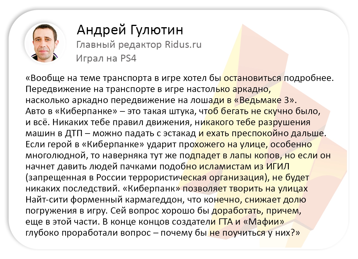Казалось бы, ситуация чудовищная, и это провал. Но нет, всё-таки мы действительно получили прецедент года, настоящий медиавирус, популярность которого будет лишь нарастать — и, скорее всего, Cyberpunk 2077 получит в итоге статус культового проекта. Почему «Ридус» так считает и почему не стоит судить игру по запуску — подробно объясняем всей редакцией: наши сотрудники лично испытали на себе все прелести и недостатки игры.