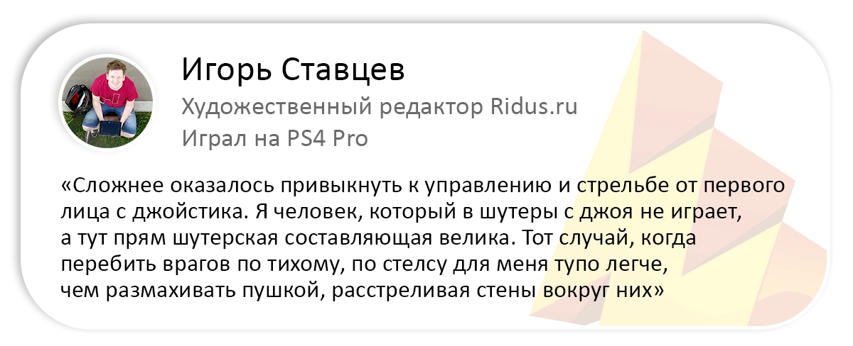 Сила игры — не в её графике, не в возможности пострелять по бегающим людишкам и даже не в атмосфере, хотя всё это безусловно её приятные стороны. Сила игры — в том, как она напрямую обращается к геймеру, провоцирует его рефлексировать и серьезно воспринимать происходящее на экране. В том числе затем был вырезан вид от третьего лица: для максимального погружения. И оно абсолютно удалось: то, что видит Ви — видишь ты.